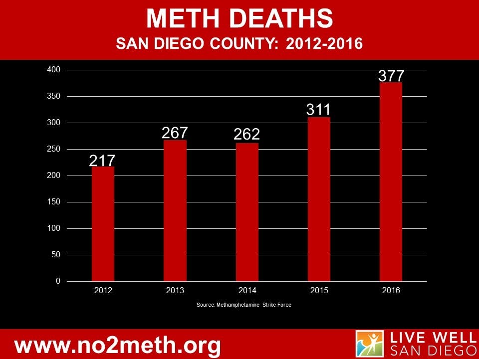There were 377 meth-related deaths in the San Diego region in 2016, the most recorded in a single year, according to a new report.