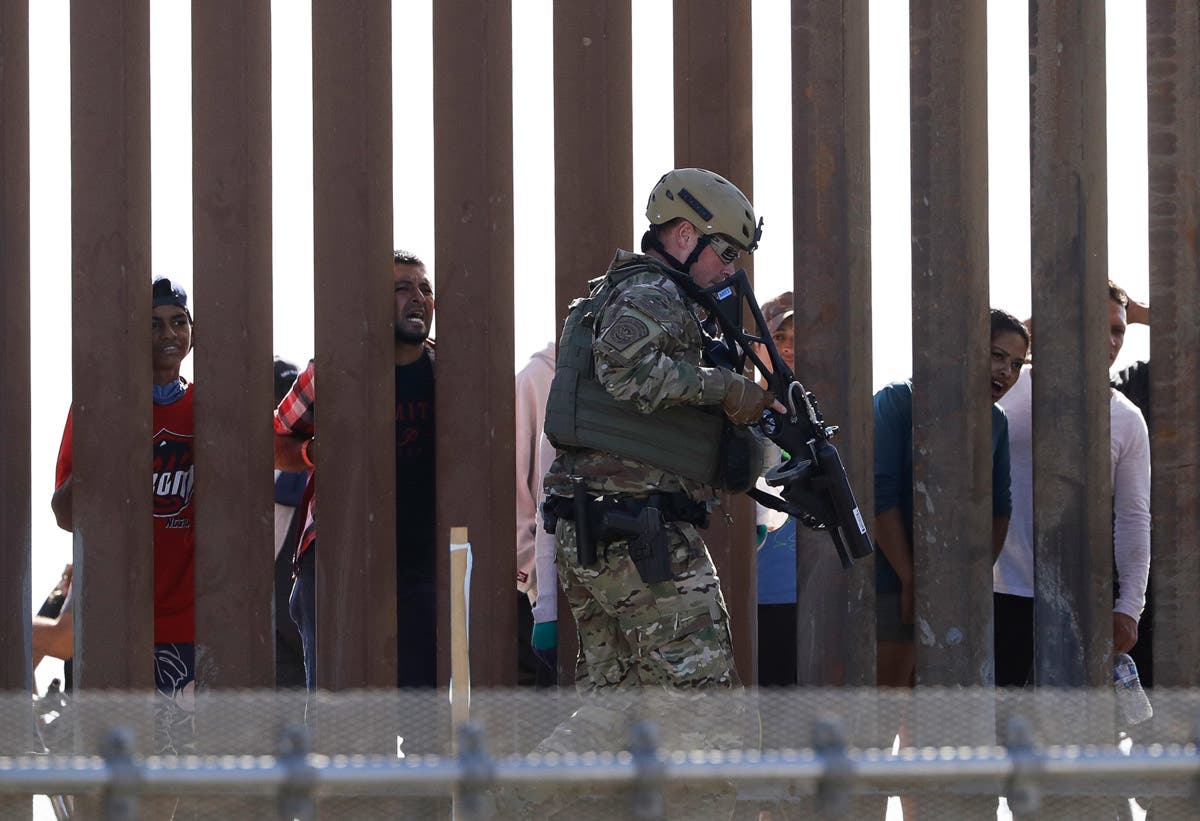 A Central American migrant is stopped by U.S. agents who order him to go back to the Mexican side of the border, after a group of migrants got past Mexican police at the Chaparral crossing in Tijuana, Mexico at the border with San Ysidro, California. (AP Photo/Pedro Acosta)