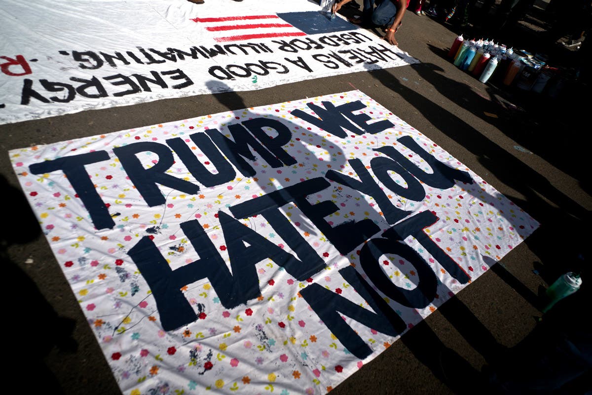 The shadow of a migrant is cast on a homemade protest banner that reads: "Trump we hate you not" at the Benito Juarez Sports Center serving as a temporary shelter for Central American migrants, in Tijuana, Mexico. (AP Photo/Ramon Espinosa)
