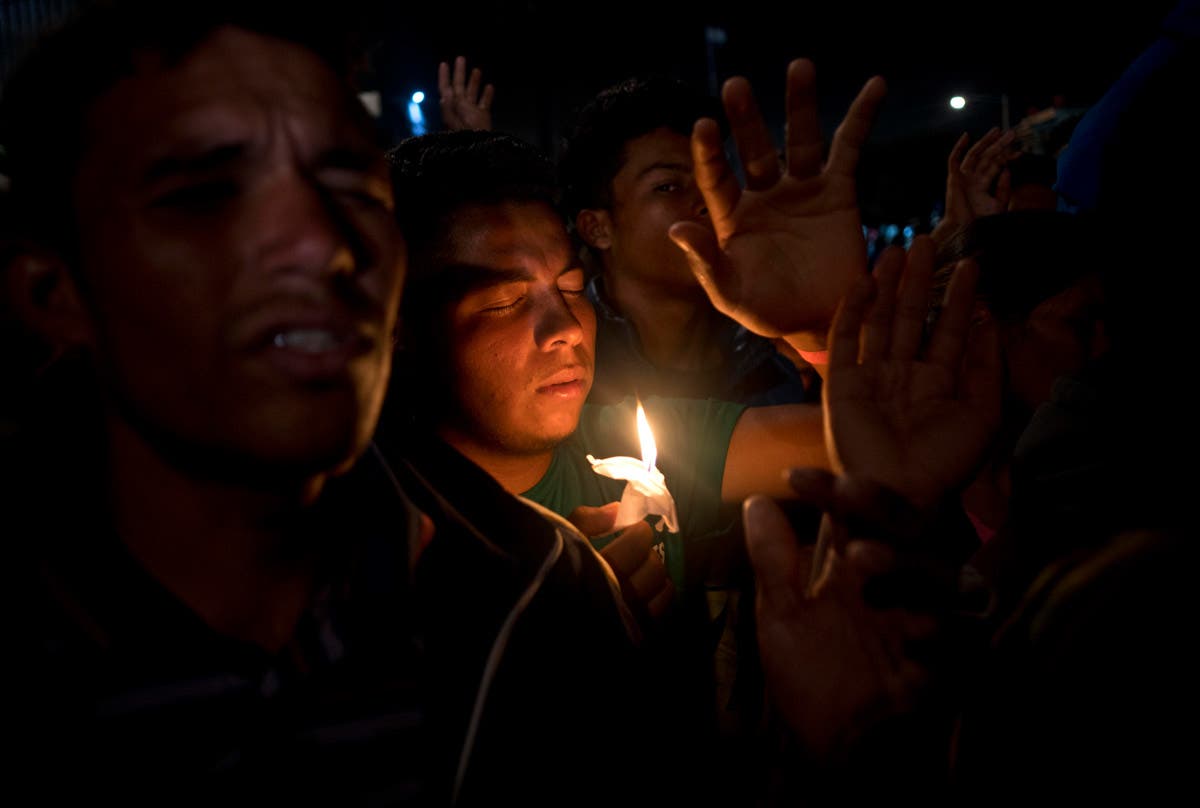 Migrants pray during a vigil outside the Benito Juarez Sports Center serving as a temporary shelter for Central American migrants in Tijuana, Mexico. (AP Photo/Ramon Espinosa)