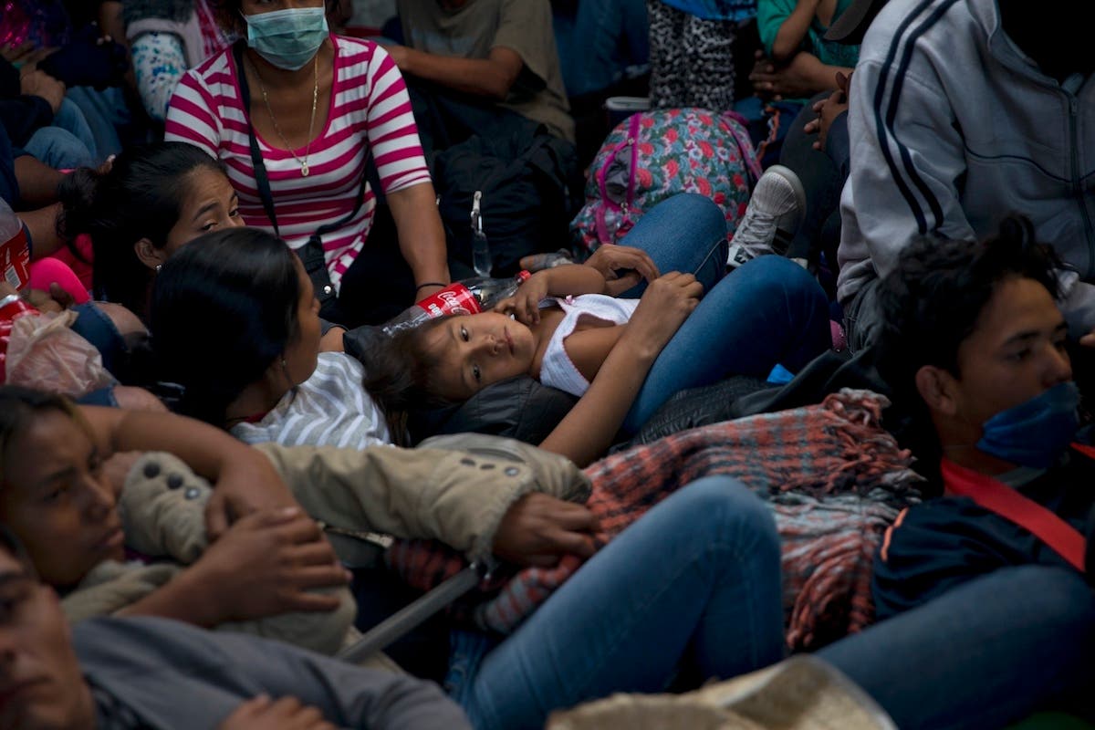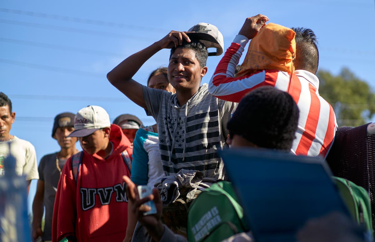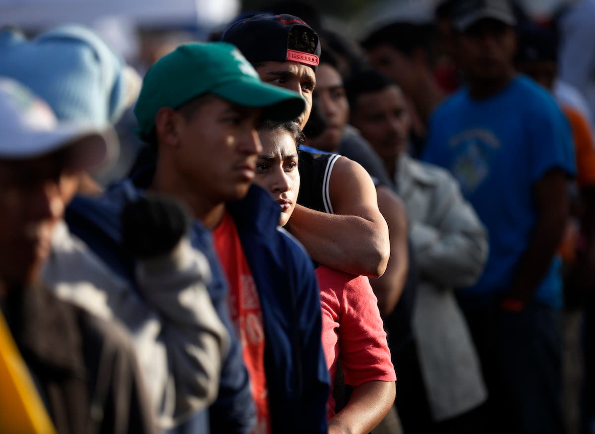 Migrants from Central America line up to begin the process of returning to their countries with the help of the International Organization of Migration outside a shelter set up for members of the migrant caravan. (AP Photo/Gregory Bull)