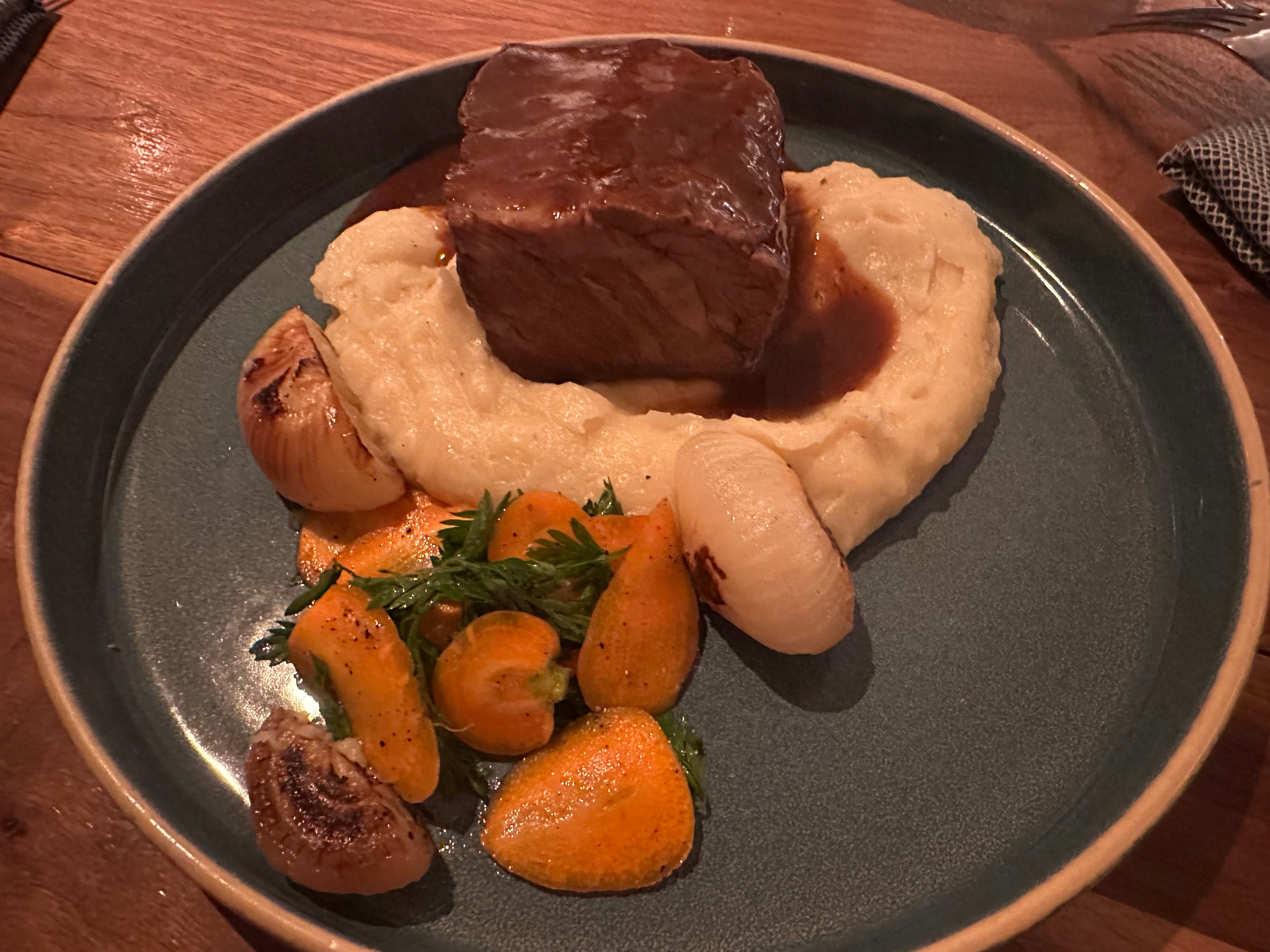 We ordered the Club Burger, which comes with cheddar cheese, burger sauce, lettuce, onion, pickle and tomato, as well as the choice of fries or house salad. We also tried the braised beef short rib, which includes creamy polenta, tomato braised gigante beans and beef jus. Short rib is one of my favorites.