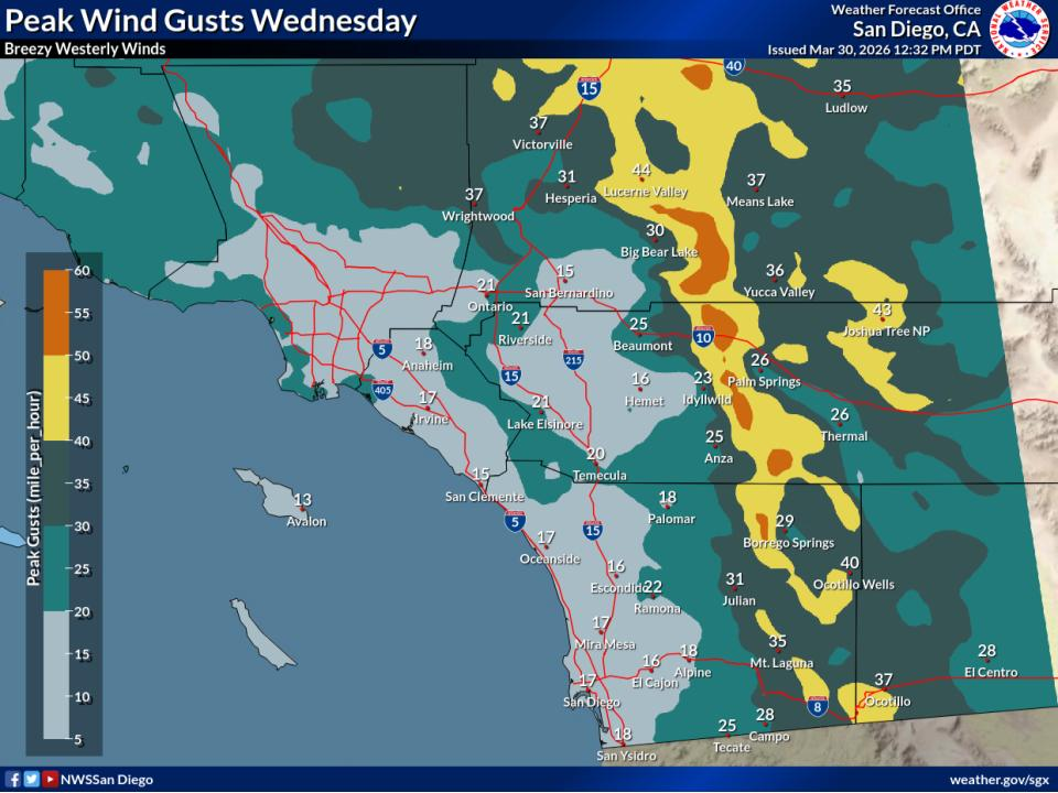 A wind advisory will be in effect from 8 p.m. Tuesday through 11 p.m. Thursday for the county deserts and mountains, according to the National Weather Service.