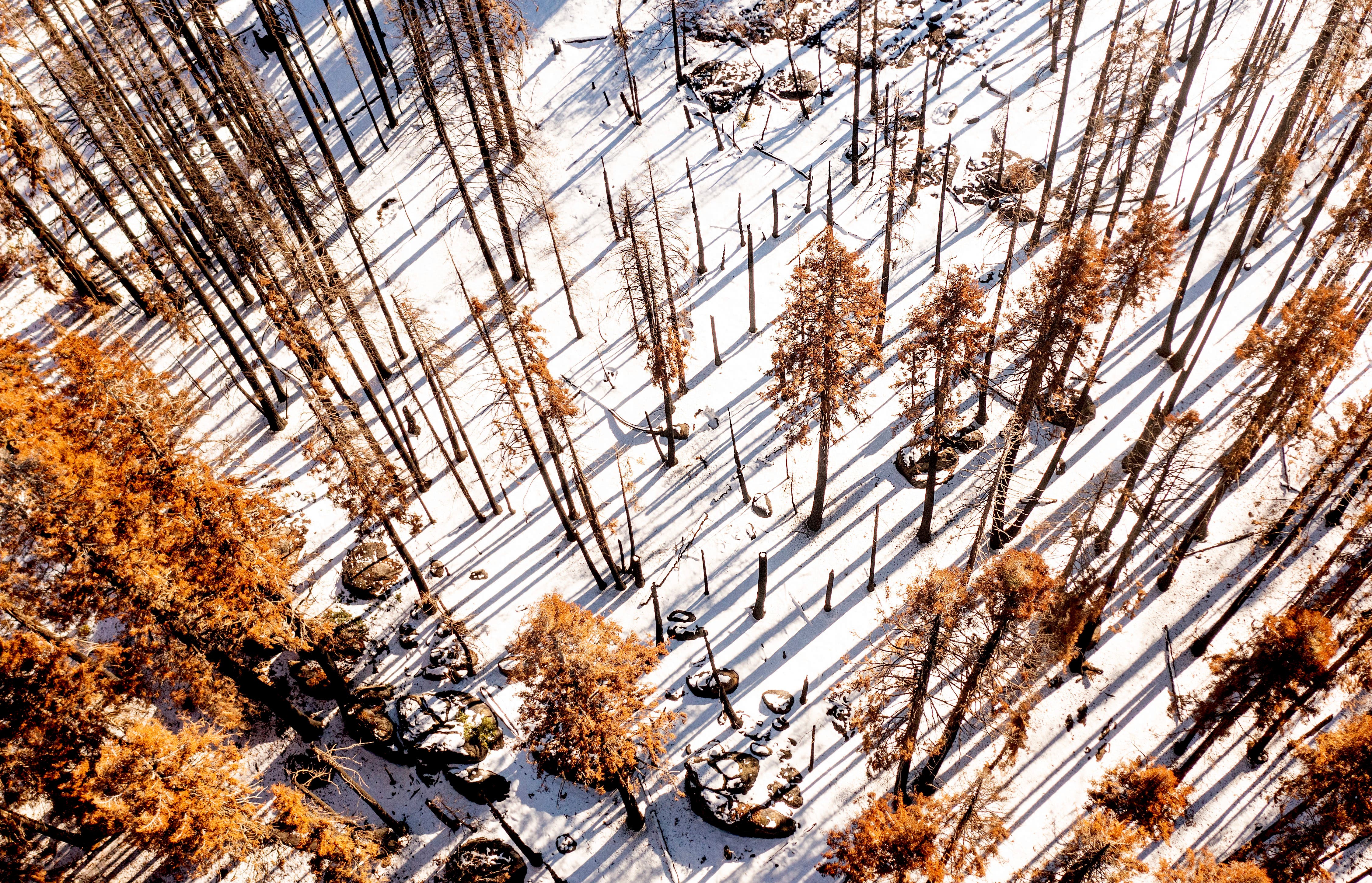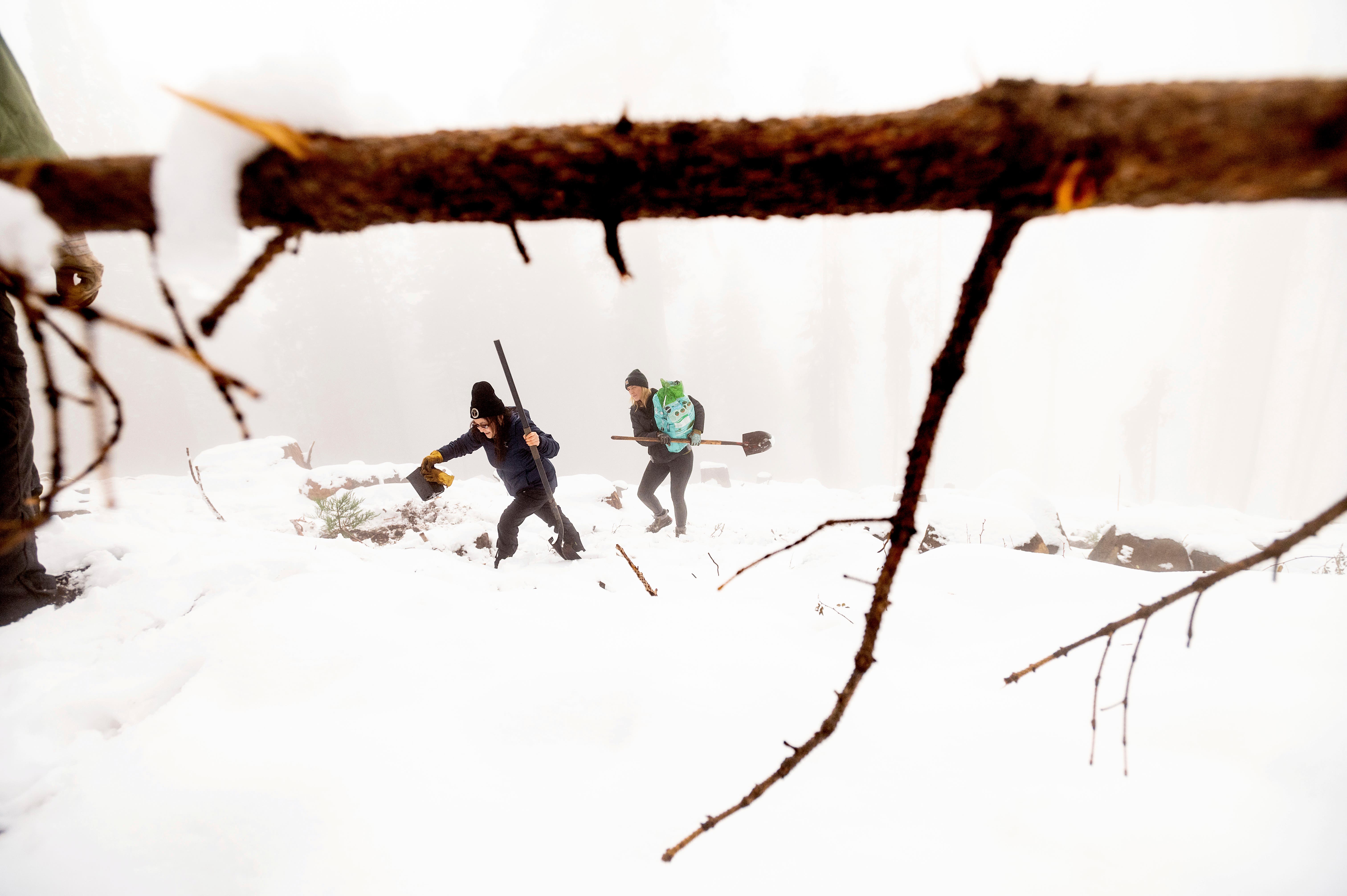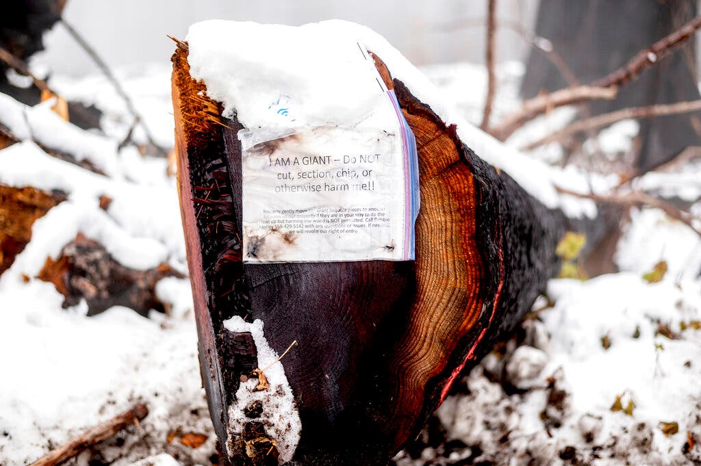 The 35 students fanned out across an area once known as "downtown" Sequoia Crest, where the original homes were built but is now a sad scene of destruction, with stumps poking from the snow like tombstones. Ashtyn and two friends carefully removed the little tree from its pot, untangled the roots and planted it near a charred rock, packing the soil around it. They named it "Timmy the Tree."
