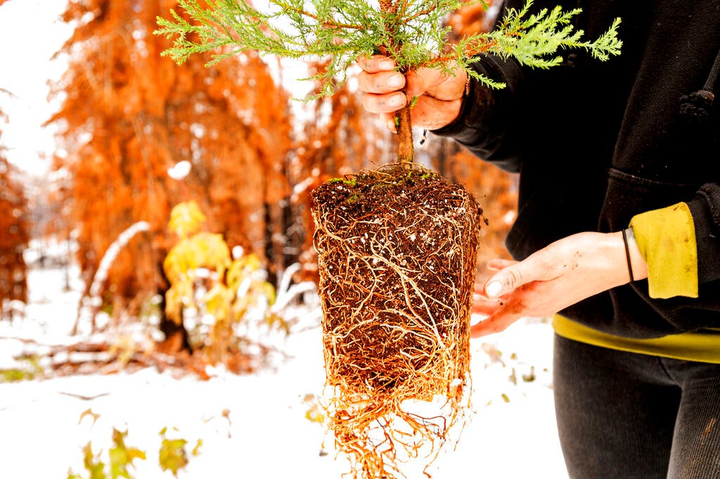 Residents who lost homes and those who were spared banded together to excavate water pipes to provide irrigation for the seedlings and, along with Archangel workers and volunteers, dug holes under a thin coat of snow last week and planted small green flags to mark planting locations.
