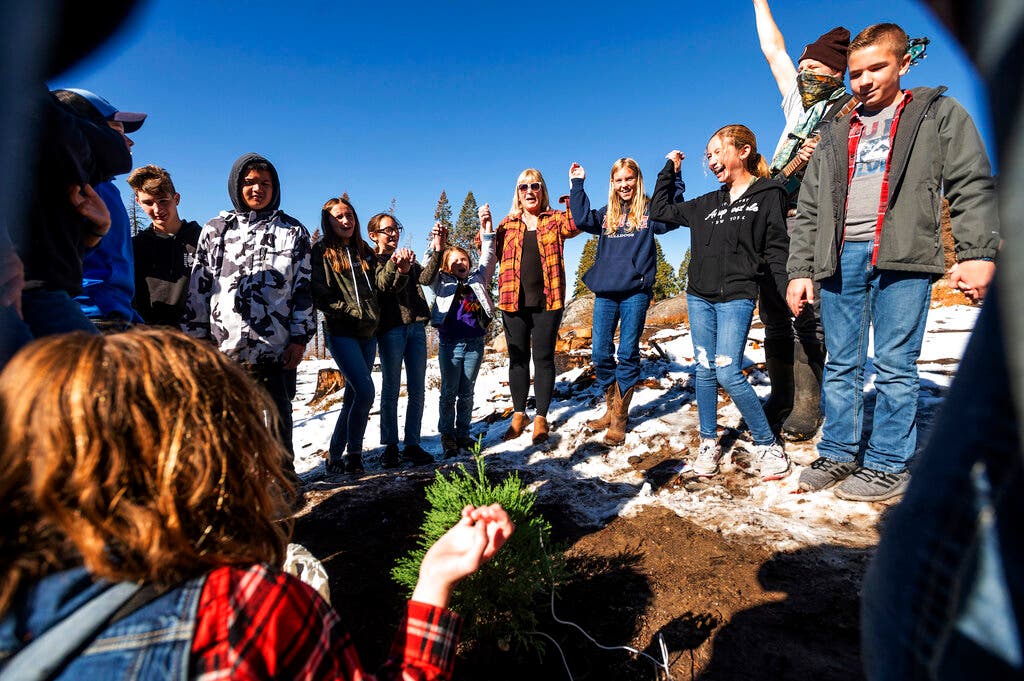 Residents were joined last week by a science class of seventh and eighth graders from Springville, which sits at the bottom of the mountain, to help plant 150 of the 7-year-old seedlings.