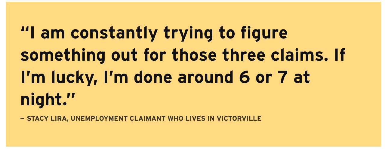 But in California, it’s not easy to track who’s getting paid for what, because there is no easily accessible public list of all state unemployment contracts. The state and its contractors stress that both the demand for benefits and volume of fraud are unprecedented. Still, ongoing confusion adds to what state lawmakers have called the Employment Development Department’s “very poor history”of paying outside entities to patch holes in the safety net as workers try to survive in financial limbo.