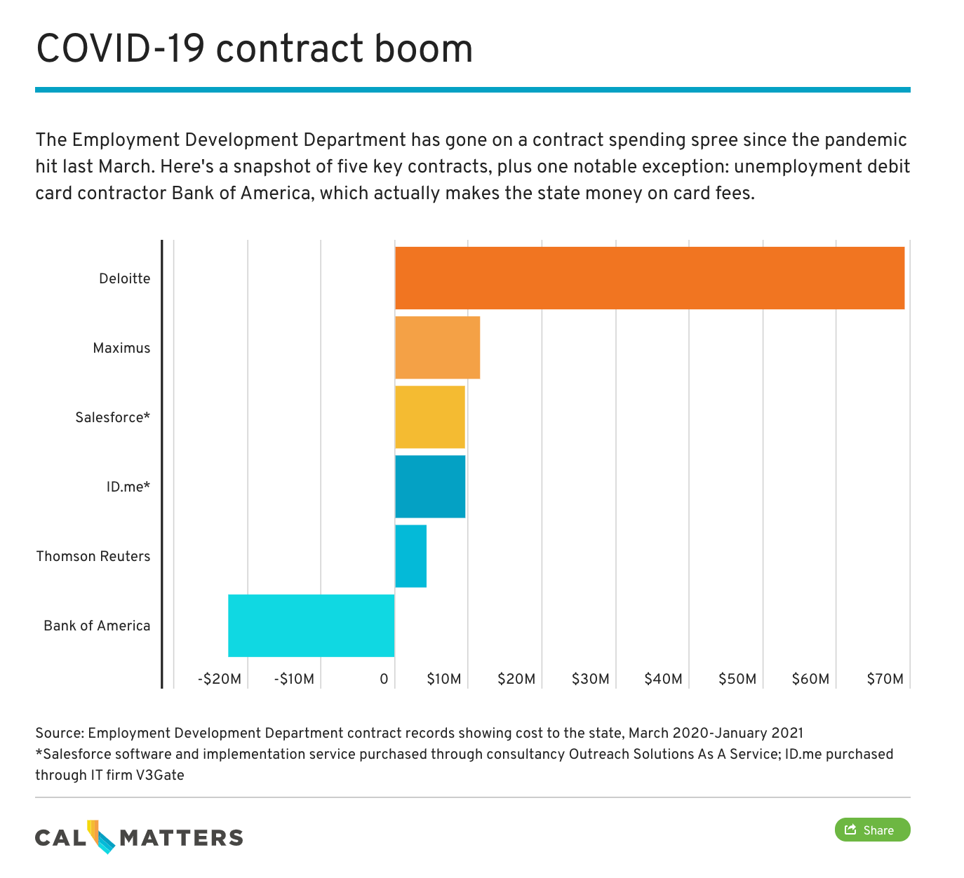 The $236 million in contracts that the department has signed since last March pay for outside companies to help track jobless claims, verify worker identities, analyze records for potential fraud, assist with customer service and more. CalMatters requested and analyzed detailed contract records for five vendors working on key customer service and anti-fraud projects — Deloitte, Maximus, Thomson Reuters, ID.me vendor V3Gate and Salesforce vendor Outreach Solutions as a Service — which total at least $103.8 million and have ballooned in cost over time, but which the state says were crucial in a crisis.