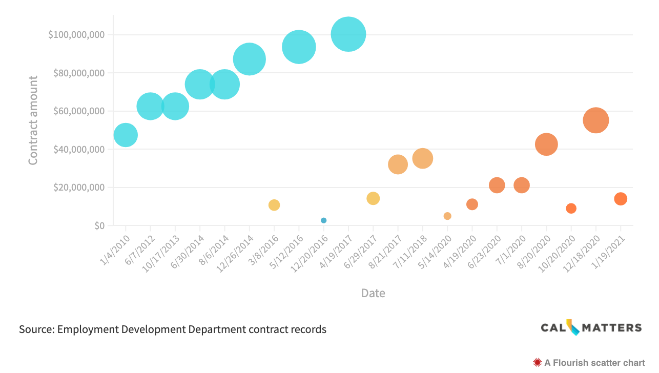 Since signing on to help overhaul the California Employment Development Department’s antiquated computer systems in 2010, consulting giant Deloitte has racked up at least a $221 million tab with the agency in a series of contracts that ballooned over time. Each color represents a different contract.
