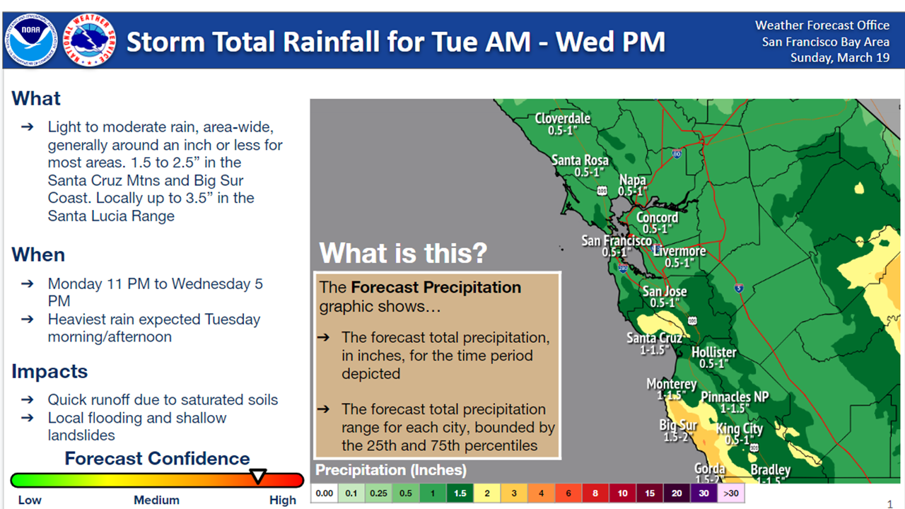 The Santa Cruz Mountains and Big Sur could pick up 2.5 inches of rain, and up to 3,5 inches is possible over the Santa Lucia Range.