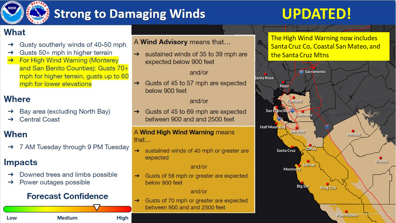 Monterey and San Benito counties meanwhile will be under a high wind warning, with gusts as high at 60 mph at lower elevations and topping 70 mph at higher elevations.