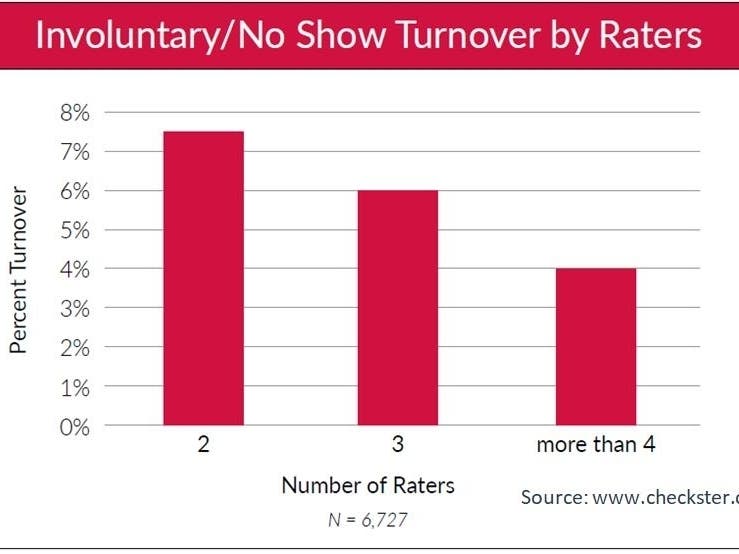 Data analysis of the total number of references who provided feedback on the candidates in the study was correlated with first year turnover. Candidates who had three or less references providing feedback showed significantly higher rates of turnover and no shows on first day of employment. The biggest difference between obtaining two and four references was an increase in involuntary turnover and no show by as much as 80%.