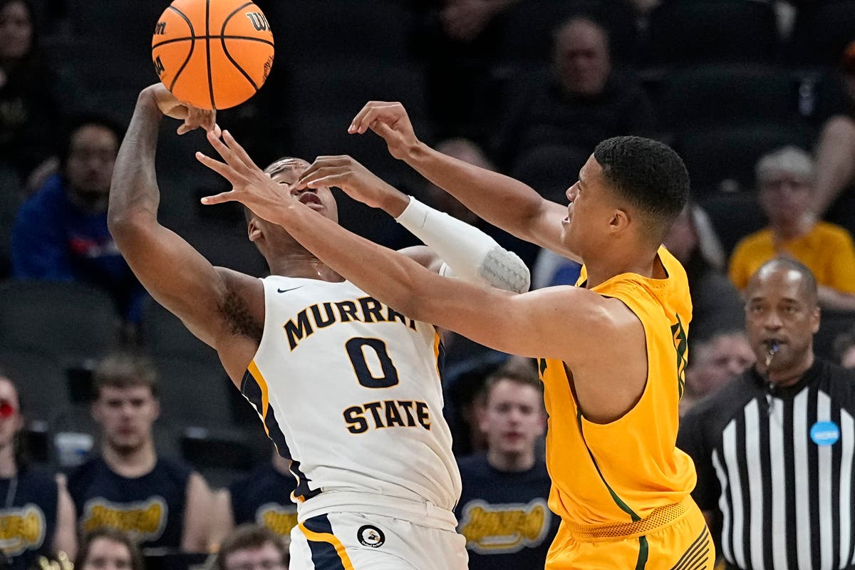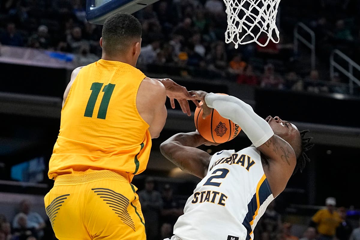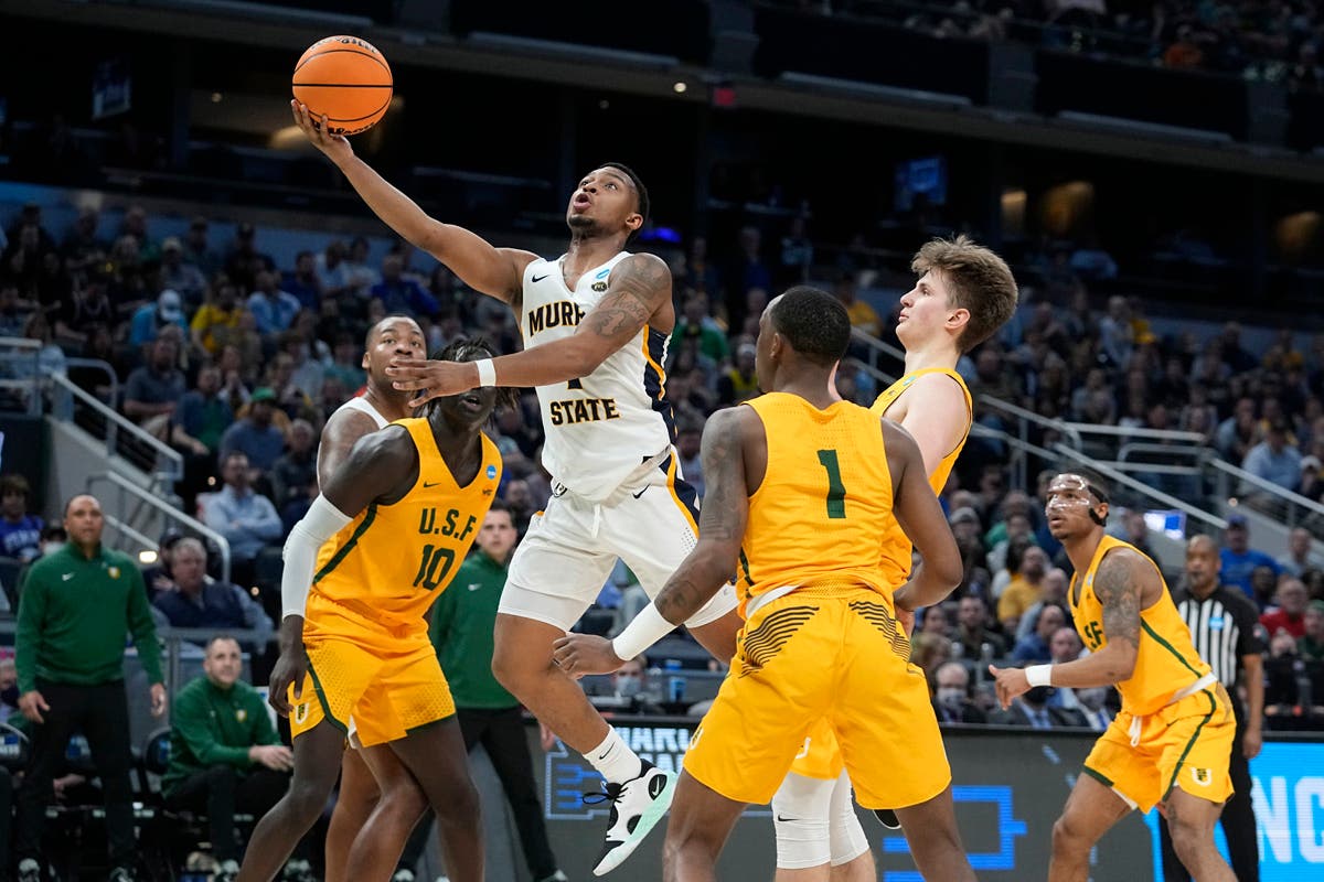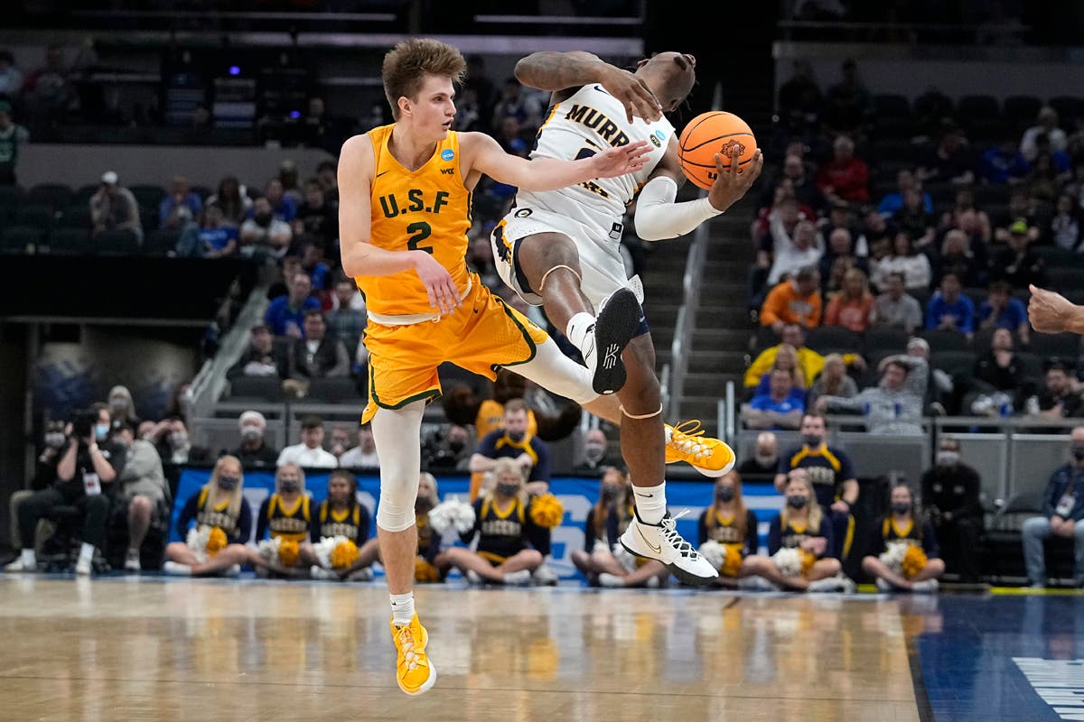 San Francisco forward Patrick Tape, right, tries to steal the ball from Murray State forward KJ Williams (0) during the second half of the game. (AP Photo/Darron Cummings)San Francisco guard Jamaree Bouyea celebrates after making a 3-point basket during the second half of the game. (AP Photo/Darron Cummings)San Francisco guard Jamaree Bouyea (1) shoots over Murray State guard Trae Hannibal (2) during the second half of the game. (AP Photo/Darron Cummings)San Francisco forward Patrick Tape (11) blocks a shot by Murray State guard Trae Hannibal (2) during the first half of the game. (AP Photo/Darron Cummings)Murray State guard Trae Hannibal catches a pass ahead of San Francisco guard Julian Rishwain, left. (AP Photo/Darron Cummings)Murray State guard Justice Hill (14) fights for a loose ball with San Francisco guard Khalil Shabazz, left. (AP Photo/Darron Cummings)Murray State head coach Matt McMahon directs his team during the first half of the game. (AP Photo/Darron Cummings)San Francisco guard Khalil Shabazz reacts after being called for a foul during the first half of the game.. (AP Photo/Darron Cummings)Murray State forward Nicholas McMullen (32) drives to the basket between San Francisco center Volodymyr Markovetskyy, left, and guard Julian Rishwain (2) during the first half of the game. (AP Photo/Darron Cummings)Murray State guard Justice Hill (14) is fouled by San Francisco center Volodymyr Markovetskyy, left, during the first half of the game. (AP Photo/Darron Cummings)Murray State guard DaQuan Smith, center, drives to the basket ahead of San Francisco guard Jamaree Bouyea (1) during the first half of the game. (AP Photo/Darron Cummings)