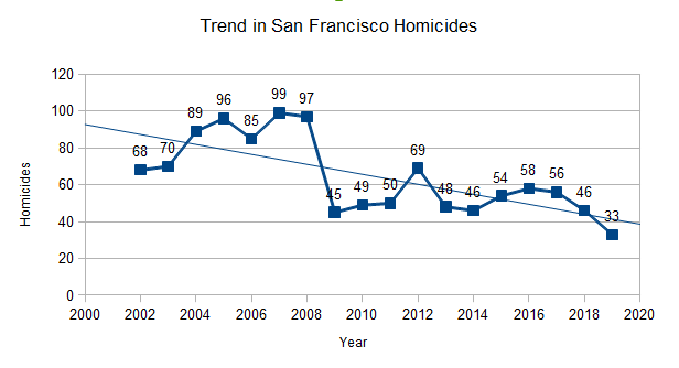 SAN FRANCISCO, CA — San Francisco homicides may drop this year to their lowest level in 17 years, according to new numbers released by the Police Department Wednesday.
