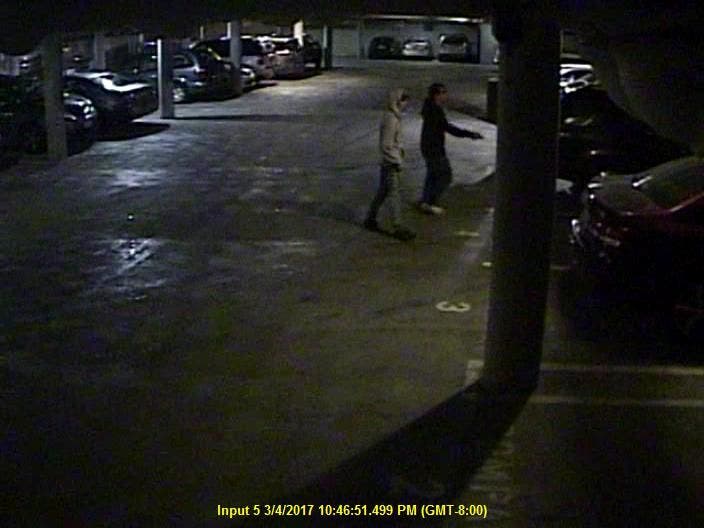 The victim was parking her car at 10:26 p.m. in the garage of her apartment complex on Florida Street when she got out of the car and was met by two men.