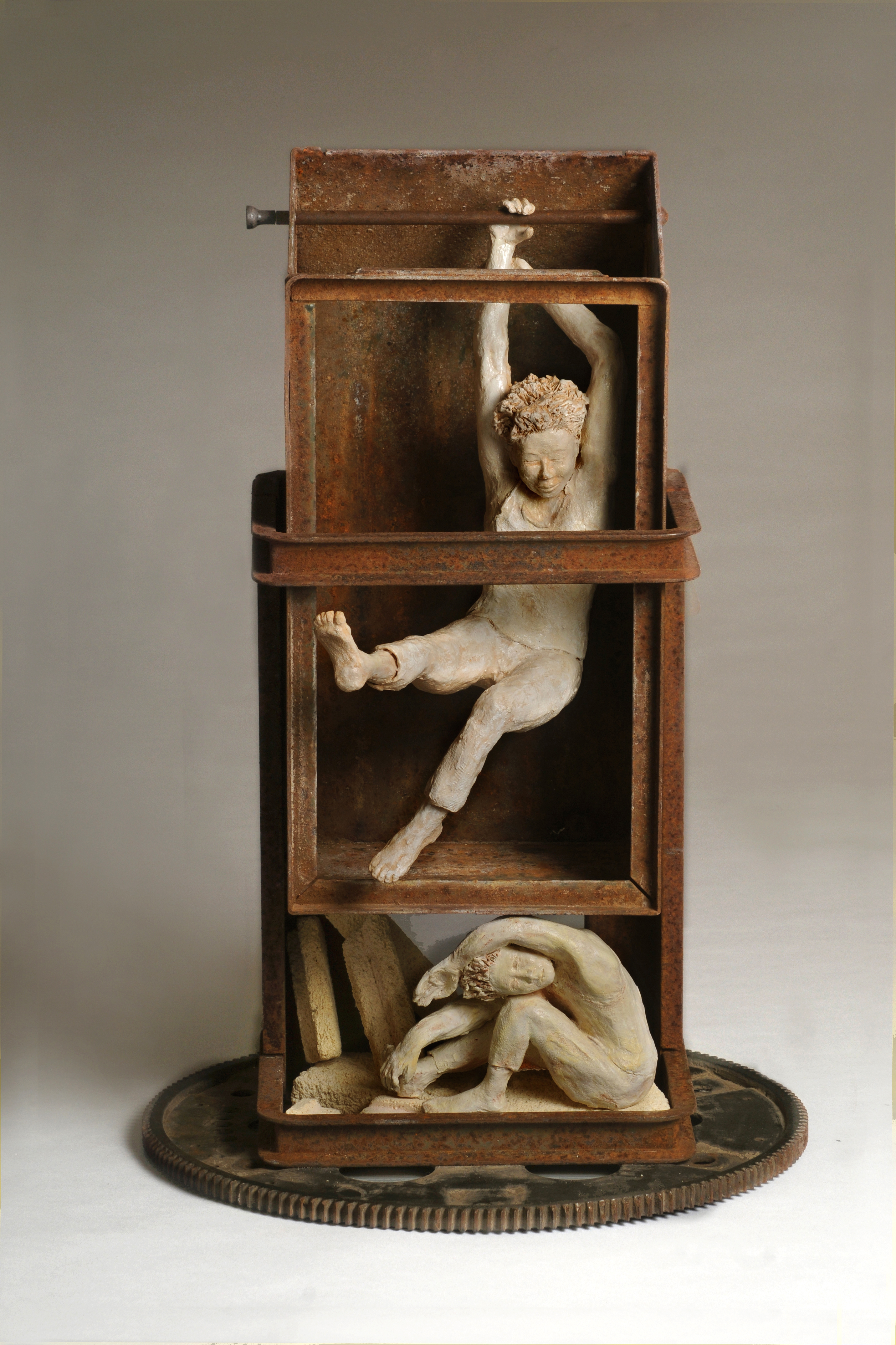 Fairfax artist Sandra Cohn’s work Integrates sculptures with salvaged rusted metal pieces and written word. The resulting work is a study of movement and interaction, an invitation to shift perspective and experience altered frames of reference. Cohn assimilates old pieces of broken necklaces, fabric, paper and even rose petals from her garden into her work, often using surplus home improvement materials which evokes an aesthetic of beauty that arises from damaged, discarded, or commonplace elements.