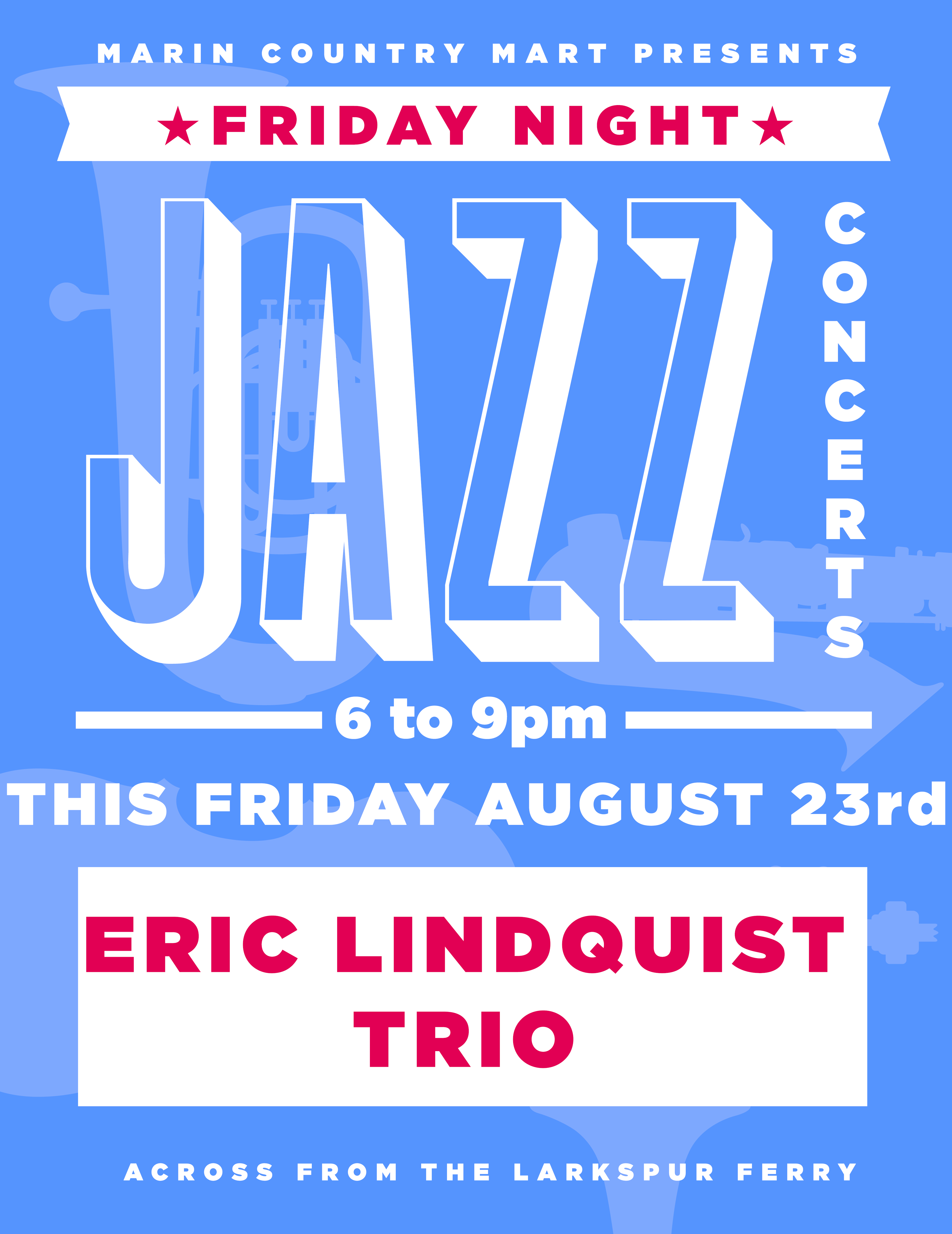 Come to the Marin Country Mart on Friday, August 23, to hear free live jazz! Eric Lindquist Trio will be playing from 6 - 9 pm in the courtyard.