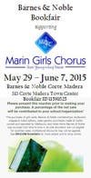 Please help support Marin Girls Chorus by shopping at Barnes & Noble, 313 Corte Madera Town Center, Corte Madera, California, May 29-June 7, 2015, with a Bookfair voucher (Voucher #11591625). For more information, contact Laurel Kidd, Community Business Development Manager for Barnes & Noble Corte Madera, at crm2274@bn.com.