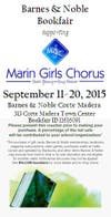 Friday through Sunday, September 11-20, 2015, Barnes & Noble will donate a percentage of every sale made with a special Bookfair voucher (Voucher #11616091 ) to Marin Girls Chorus! Vouchers will be available online at the Marin Girls Chorus website www.marinchorus.org and in hard copy at MGC rehearsals and events between now and the bookfair. Customers and supporters are encouraged to shop throughout the store to support the Chorus.