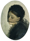 At first glance they may appear to be detailed yet delicate airbrushed photographs instead of multiple layered paintings. One good example is “In Mourning,” a graceful, pensive 1880 oval creation.