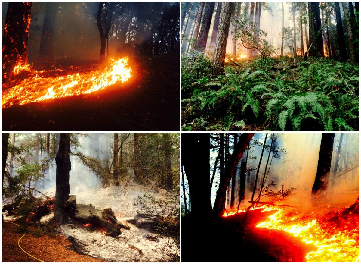 One of Marin County’s largest redwood groves was charred by a wildfire Tuesday near San Geronimo, but Marin County Fire Department crews were aided by cool and foggy weather.