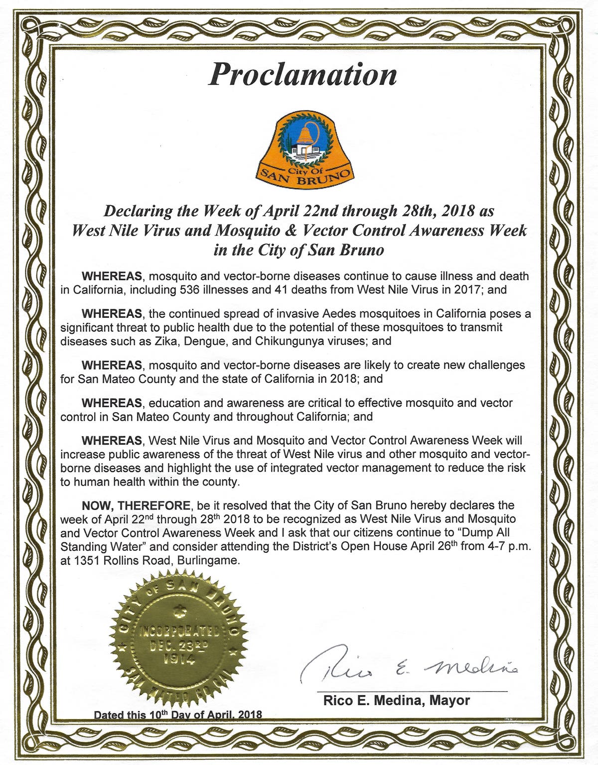 4/26/18 Open House & West Nile Virus Awareness Week Proclamation