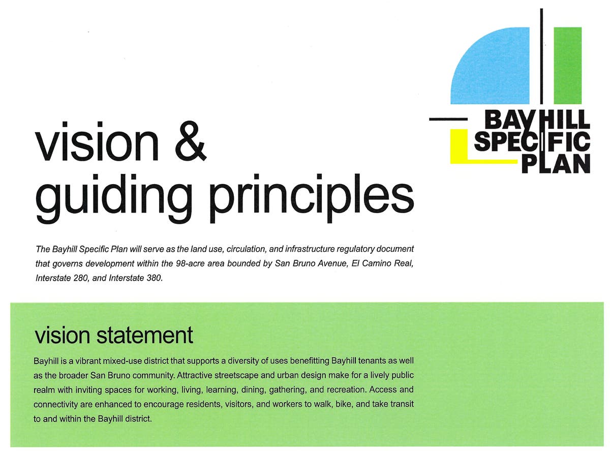 As you are aware, the City is leading preparation of a Specific Plan for the Bayhill Office Park and nearby areas. The Planning area is approximately 98 acres in total area and is bounded by Interstates 280 to the west and 380 to the north, El Camino Real to the east, and San Bruno Avenue West to the south. The Bayhill Specific Plan will outline a cohesive, long-term, community driven vision for this key area, which is home to the largest cluster of offices in the city, including Walmart.com, Kaiser Permanente, and the headquarters of YouTube, as well as several other uses.