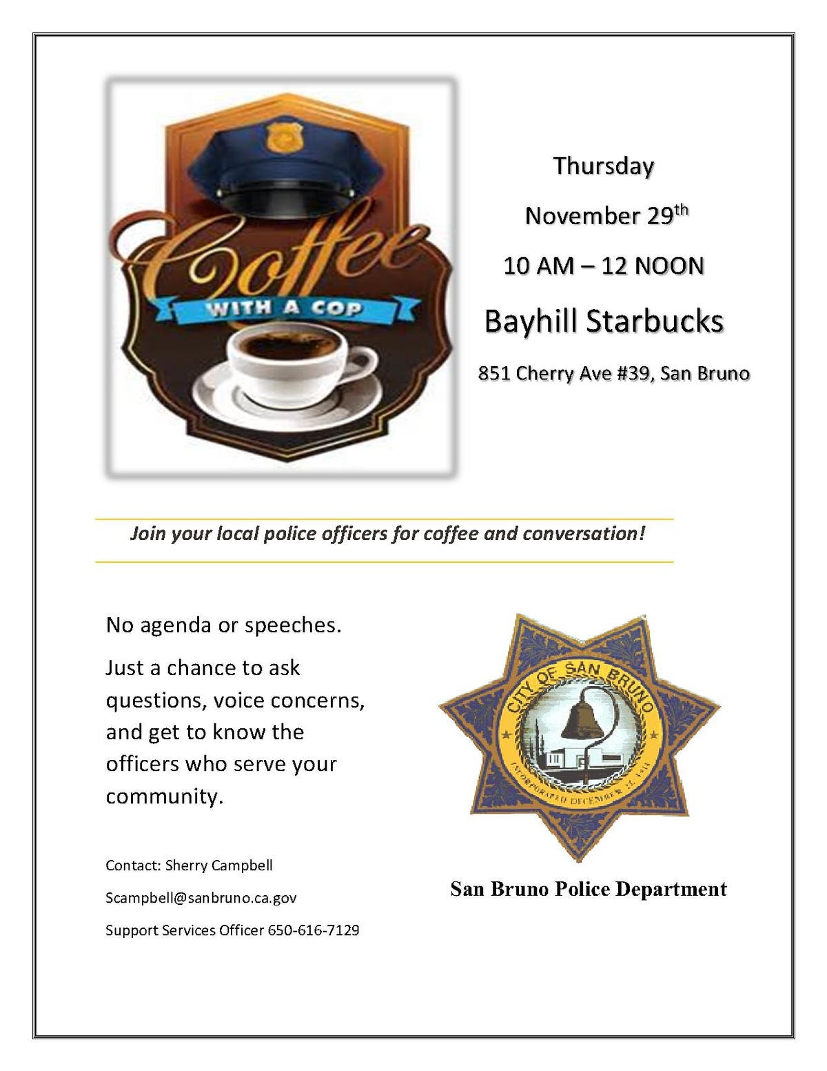 Coffee with a Cop is on Thursday 11-29-18 from 10 AM-12 NOON, at San Bruno Bayhill Starbucks.