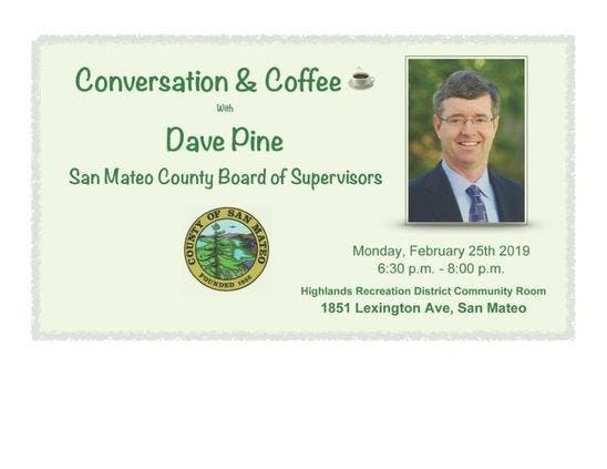 Please join San Mateo County Supervisor Dave Pine, District 1, on Monday, Feb. 25, 2019, from 6:30 to 8 p.m. for conversation and coffee at the Highlands Recreation District Community Room, 1851 Lexington Ave., San Mateo.