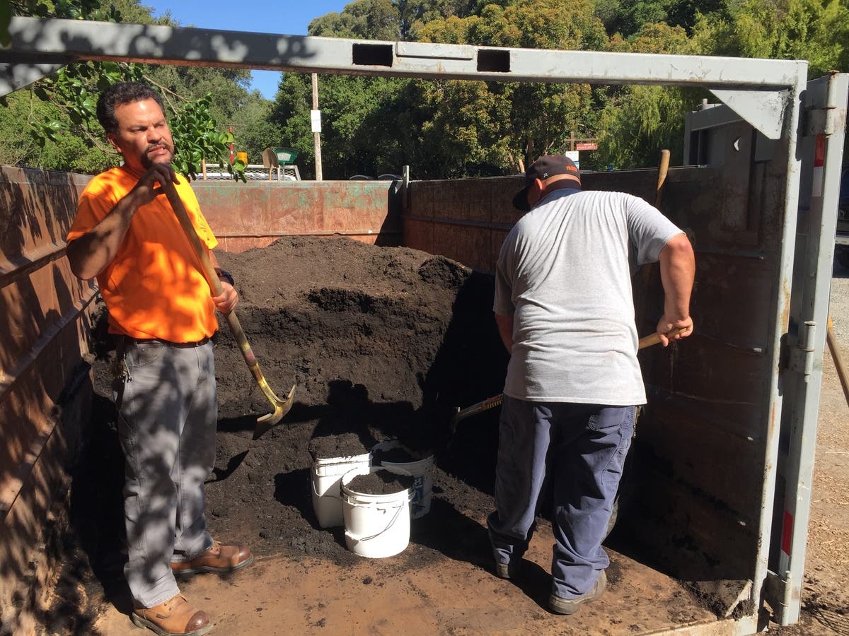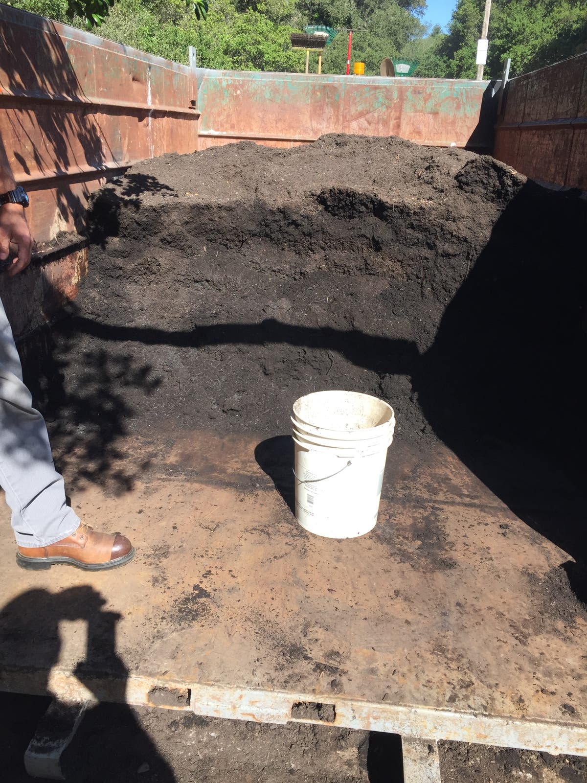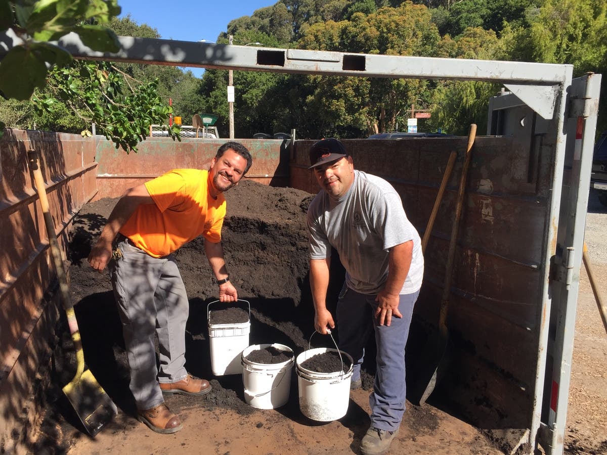The day started at 8:00 a.m. with Recology San Bruno returning a 20 yard container of compost made from food scraps and yard waste collected in San Bruno for recycling and to keep these wastes out of the land fill. San Bruno residents brought containers and Recology and City of San Bruno employees filled the containers, always with a FREE SMILE.
