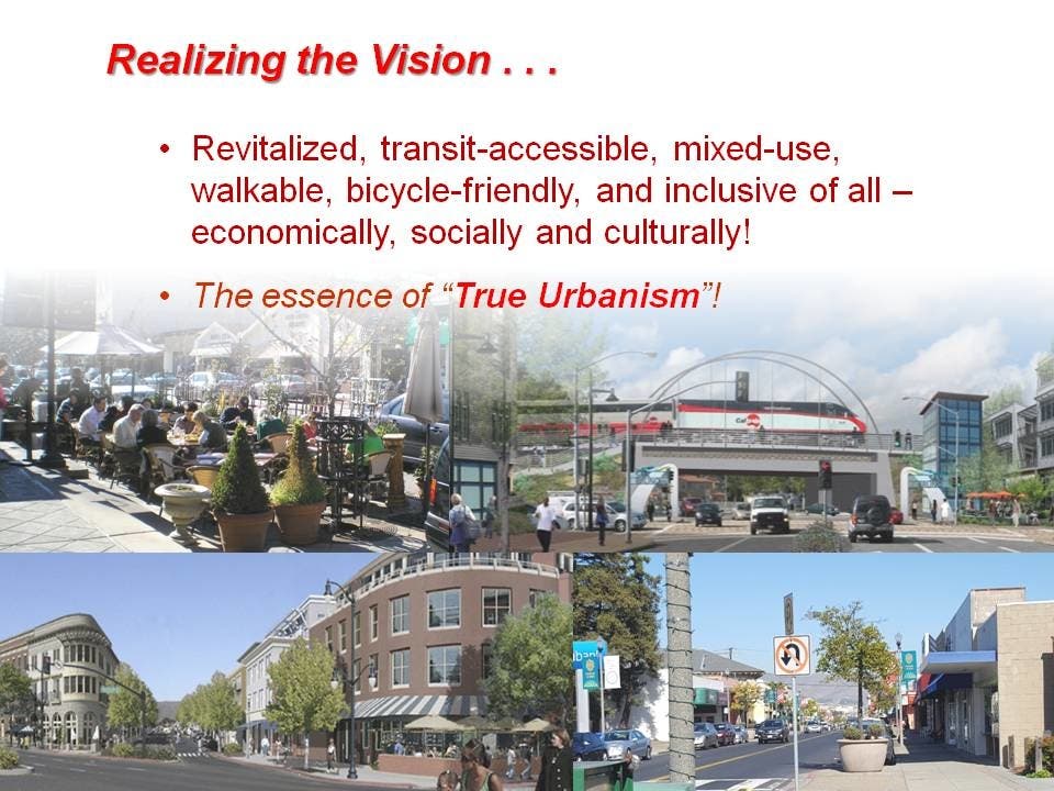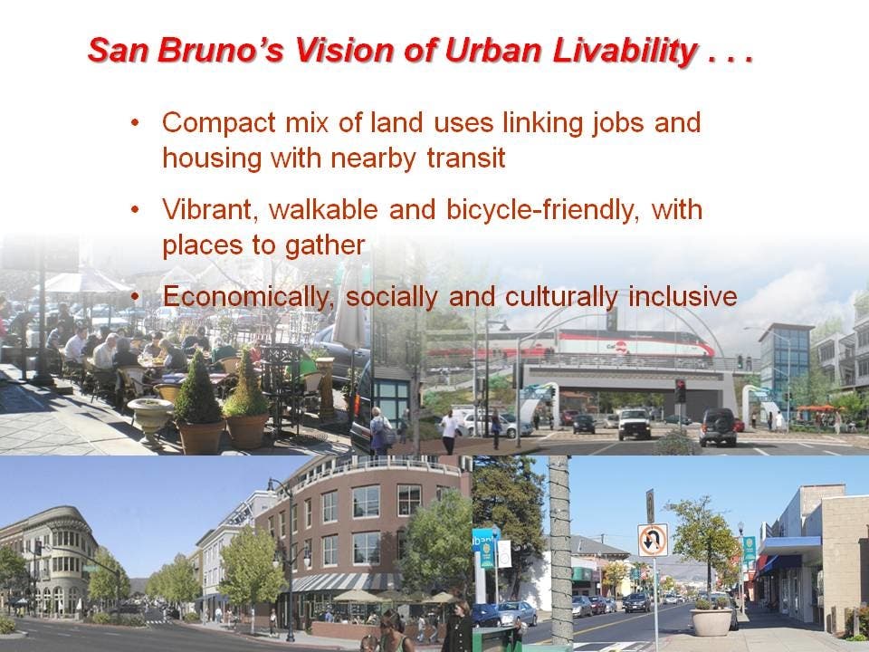 The City of San Bruno CA continues to explore various plans to continually mode its VISION forward, small step by small step and involves the input from residents.