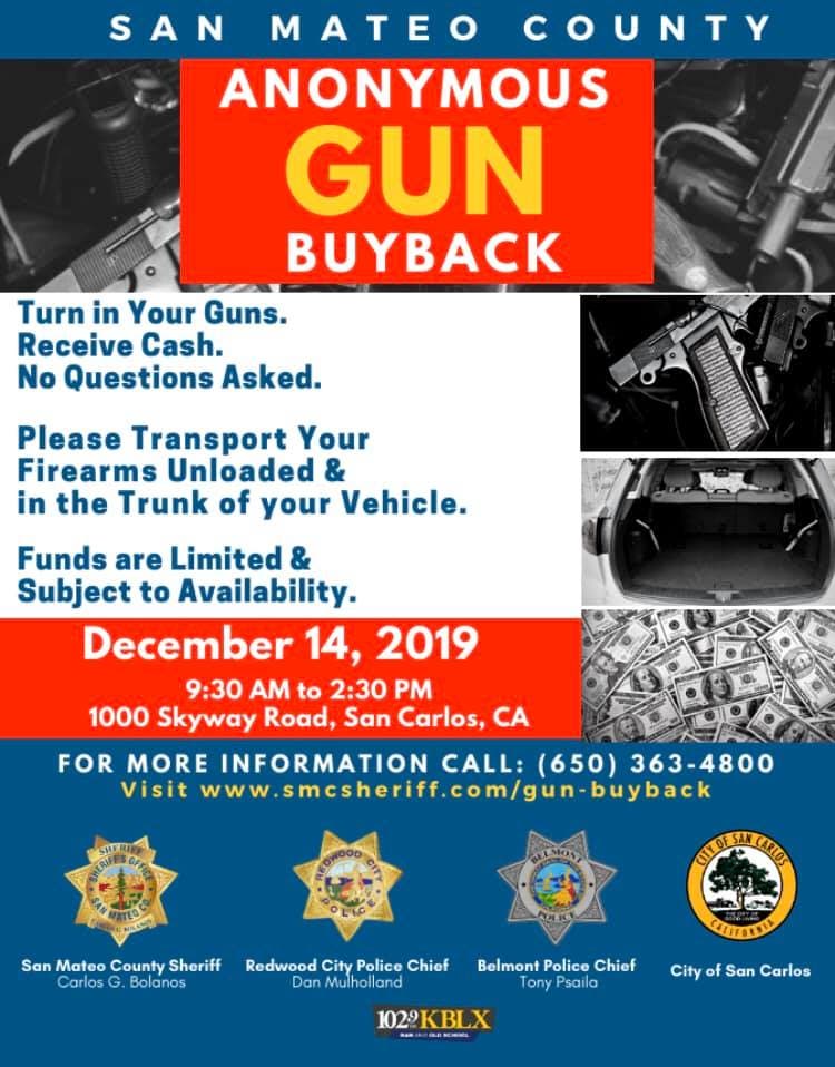 The buyback will run from 9:30 a.m. to 2:30 p.m. at 1000 Skyway Road in San Carlos, according to the San Mateo County Sheriff's Office.