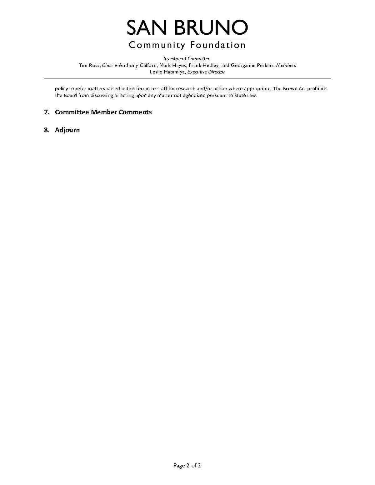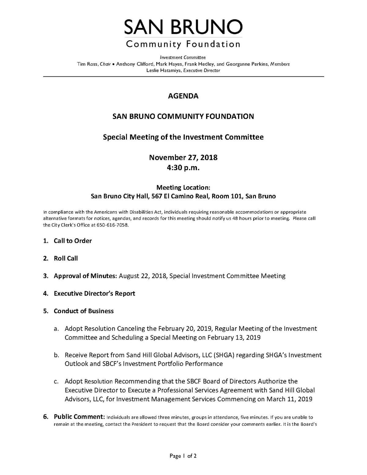 San Bruno CA Community Foundation - Investment Agenda 11/27/18