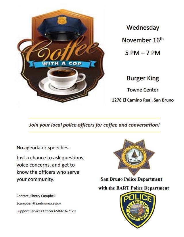 SAN BRUNO, CA β On Wednesday, November 16, 2016, officers from the San Bruno and BART Police Departments and community members will come together in an informal, relaxed space to discuss community issues, build relationships, and drink coffee. All community members are invited to attend. The event begins at 5 pm at Burger King located in the Towne Center Shopping Center.
