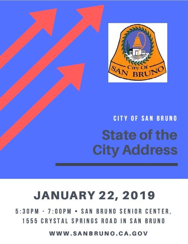 The State of the City Address will be held on Tuesday, January 22, 2019 beginning at 5:30 p.m. at the San Bruno Senior Center, 1555 Crystal Springs Road.