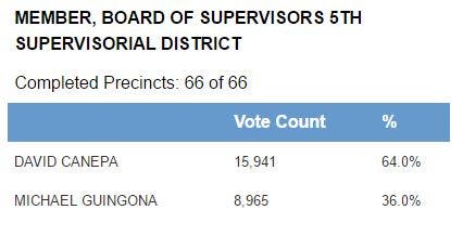 Canepa received 64 percent of the vote compared to 36 percent for Guingona and will replace Supervisor Adrienne Tissier, who is being termed out after 12 years in office.