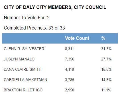 In six contested city council races around San Mateo County, planning commissioner Glenn Sylvester and personnel board commissioner Juslyn Manalo were elected to the Daly City City Council in preliminary results.
