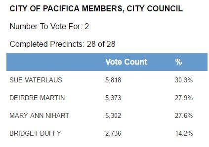 In Pacifica, City Council incumbent Mary Ann Nihart may have lost her re-election bid, coming in third behind planning commissioner Sue Vaterlaus and parks, beach and recreation commissioner Deirdre Martin, according to the unofficial results. However results are close, with just a 71 vote difference.