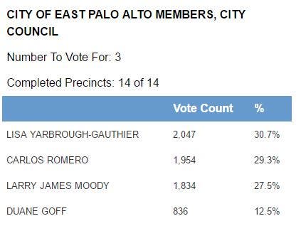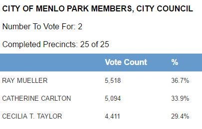 In Menlo Park, incumbents Ray Mueller and Catherine Carlton were most likely re-elected, as were incumbents Lisa Yarborough-Gauthier and Carlos Romero in East Palo Alto.
