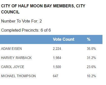 Business executive Adam Eisen and Coastside Fire Protection District board member Harvey Rarback appear to have won the two open City Council seats in Half Moon Bay.