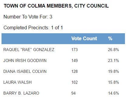 One incumbent in Colma, Rae Gonzalez, appears to have held onto her City Council seat while a second incumbent, Diana Colvin, appears to have narrowly lost her seat to law enforcement officer John Goodwin, according to the unofficial results.
