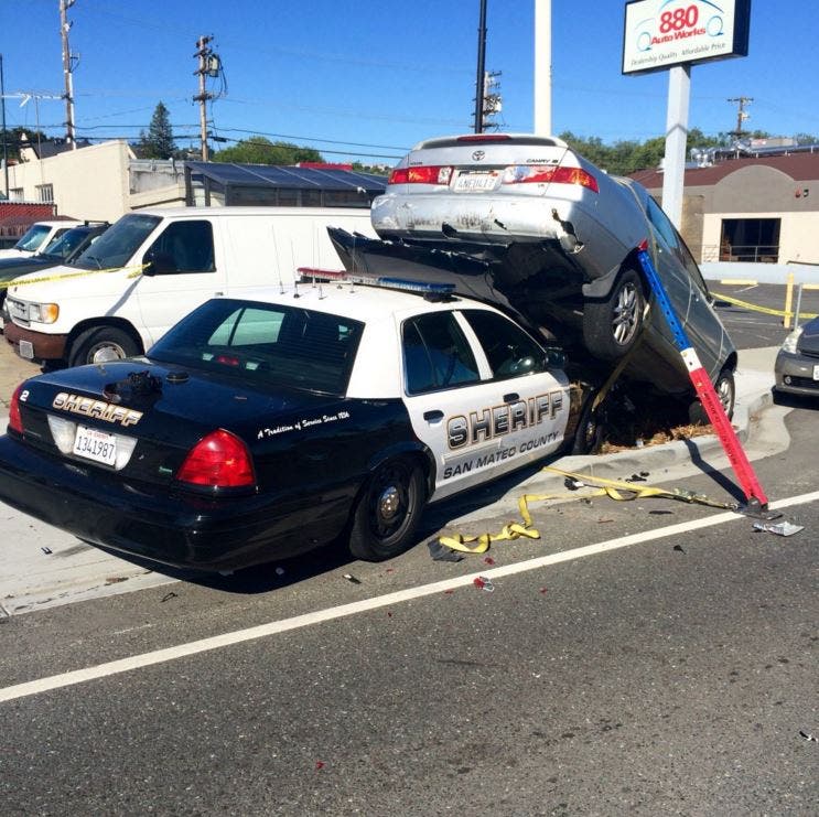 It all started around 7:40 a.m., when a woman crashed her silver Toyota Camry into a San Carlos fire station and fled, according to San Mateo County Sheriff's Sgt. Salvador Zuno. It wouldn't end in the crash until that same woman first crashed into a grocery store, then into a car and finally led police on a low-speed pursuit, he says.