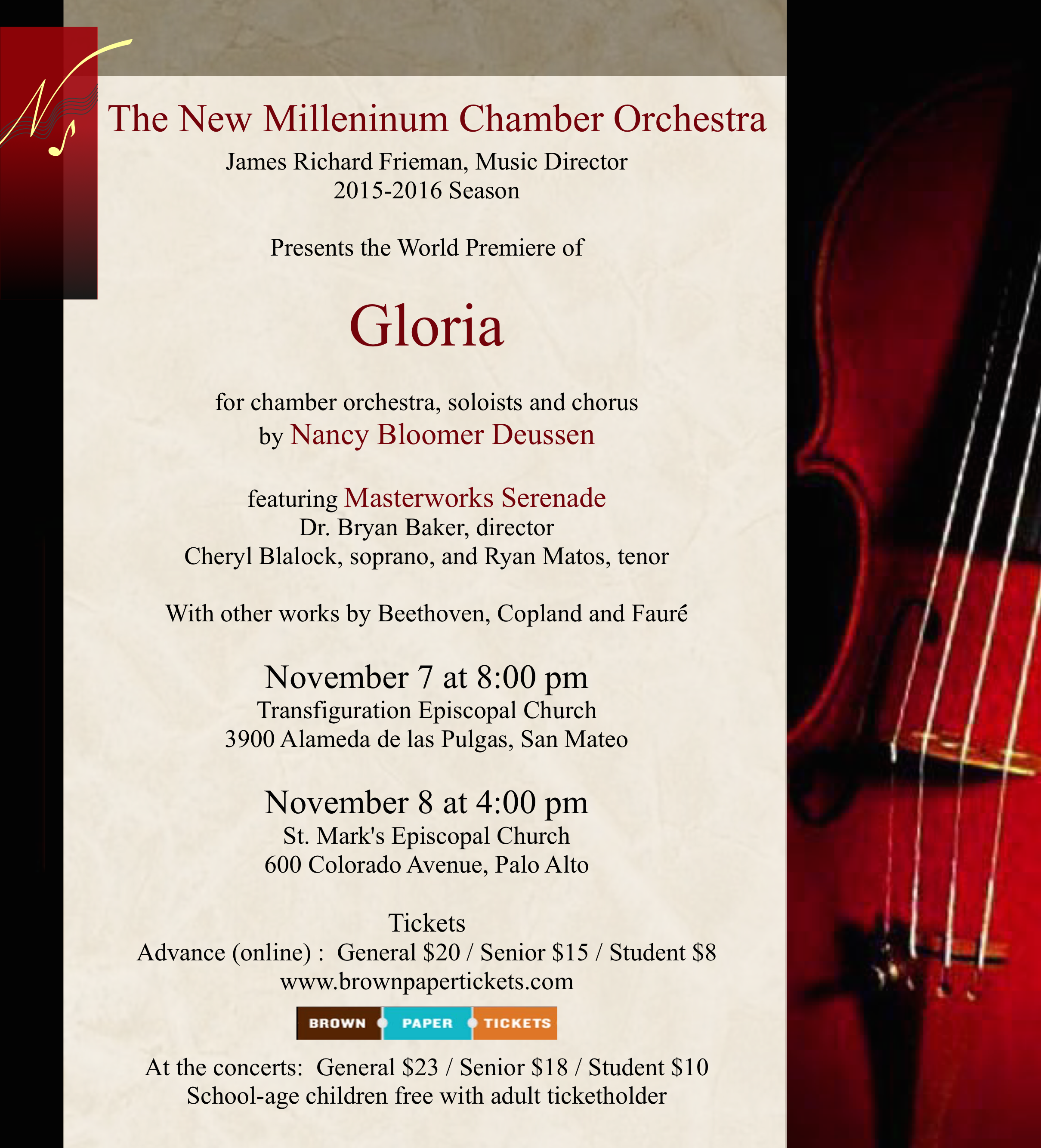 New Millennium Chamber Orchestra conducted by James Richard Frieman presents world premiere of Nancy Bloomer Deussen's "Gloria"
