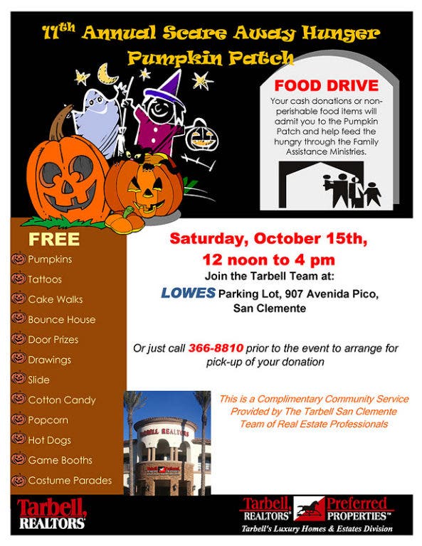 11th Annual Pumpkin Patch and Scare Away Hunger food Drive. There will be food and fun for everyone including several bounce Houses, a slide, arcade games,cake walks, a costume parade, hot dogs, cotton candy, popcorn, and a free pumpkin (one per family while supplies last). The event and all it has to offer is FREE, All we ask is for non perishable food or cash donation for the local food bank in San Clemente, Family Assistance Ministry. PLEASE STOP BY AND SEE US THERE. Sat Oct 15th from noon to 4pm. If you can not make it and would like to make a food or cash donation, please call or email me. Last year we collected over 2 tons of food and $1500 in donations. Thank you for your support