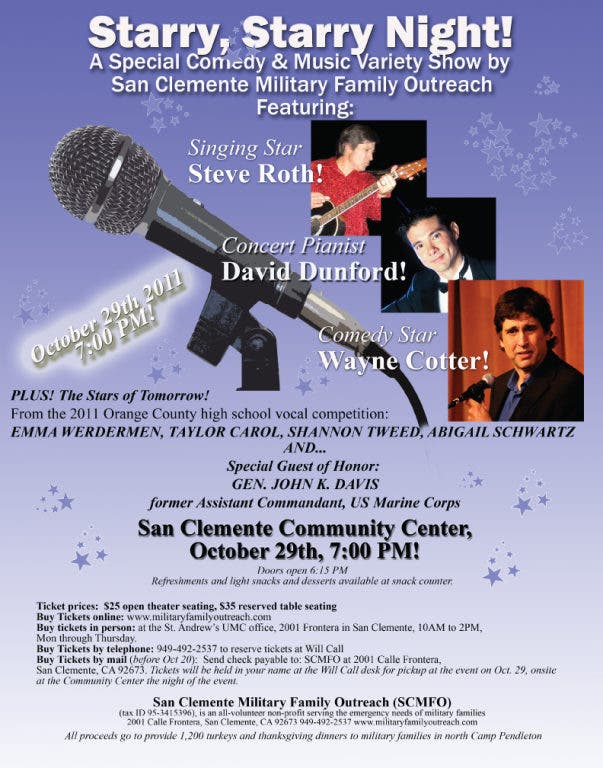 low income Marine families in north Camp Pendleton. Top professional and amateur talent in music and comedy. Sponsored by non-profit San Clemente Military Family Outreach.