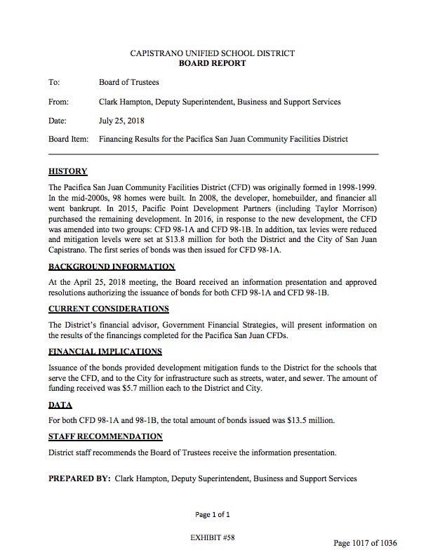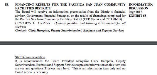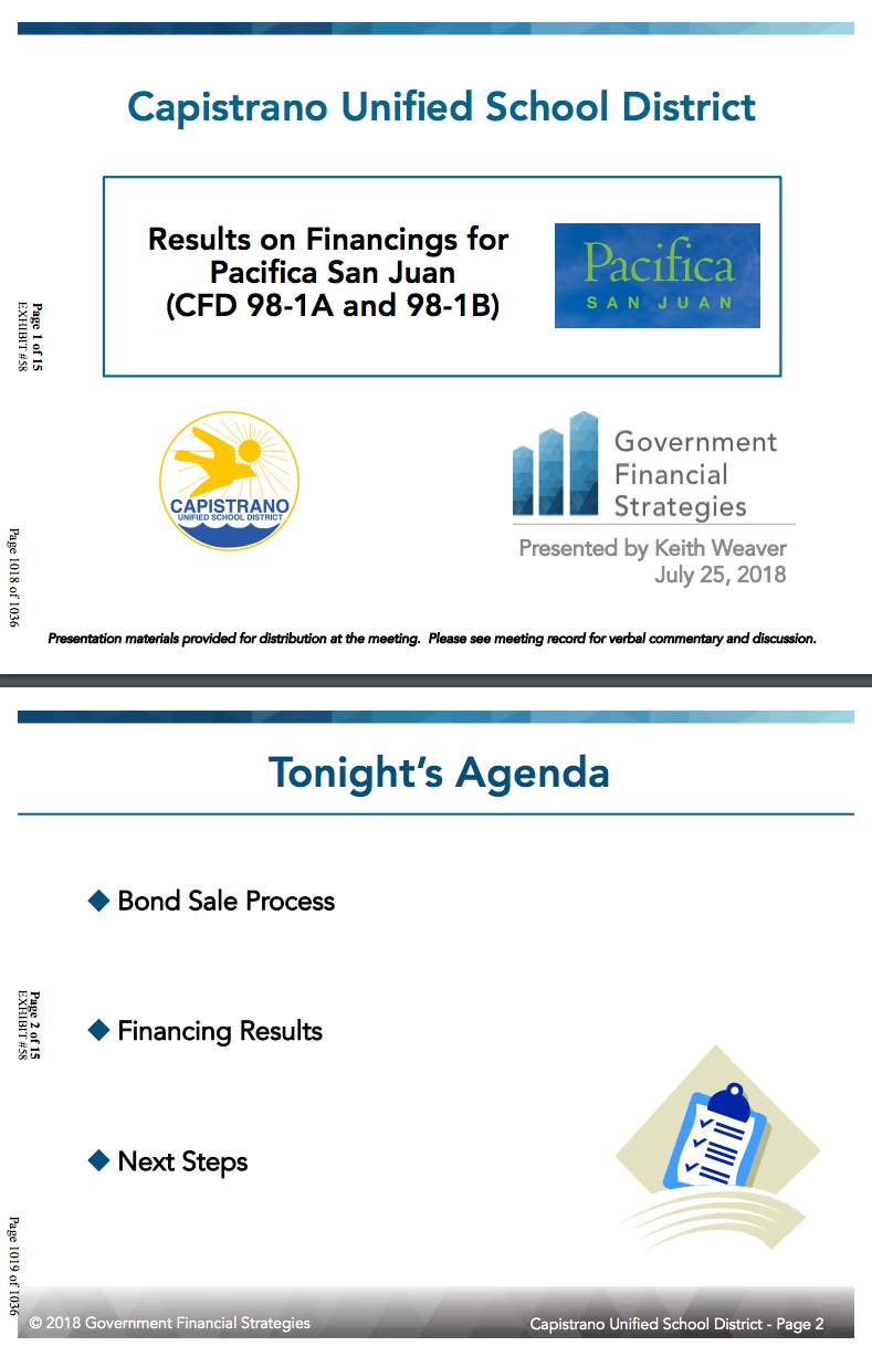 July 25, 2018 CUSD BOT Meeting Agenda Item #58 FINANCING RESULTS FOR THE PACIFICA SAN JUAN COMMUNITY FACILITIES DISTRICT