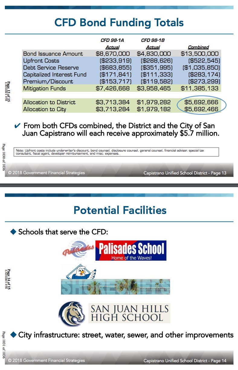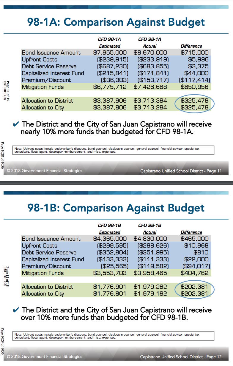 Total Allocation CFD 98-1A and 98-1B $5.7 million to City of San Juan Capistrano and $5.7 million to CUSD