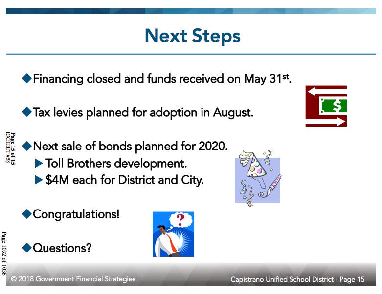 *Note: Upfront costs include underwriter's discount, bond counsel, disclosure counsel, general counsel, financial advisor, special tax consultant, fiscal agent, developer reimbursement, and misc. expenses.