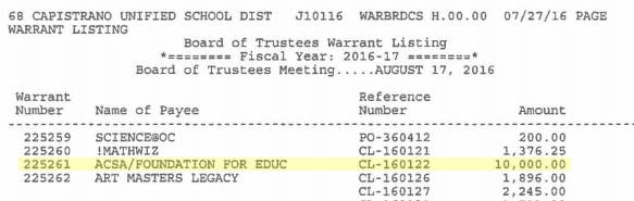 PART 1: BACKGROUND![]() ![]() It all started with the accidental discovery of a $10,000 payment to the ACSA Foundation for Educational Administration. Source: August 17, 2016 CUSD Board of Trustees Meeting Agenda page 26. |