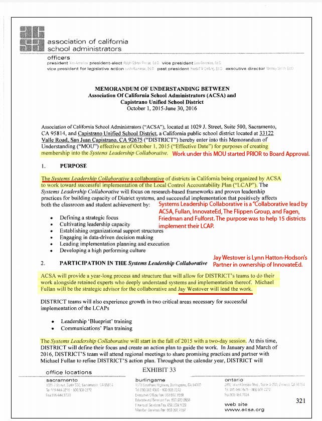 This article documents Trustee Hatton-Hodsons' business relationships and shows that CUSD has contracts with all her business partners: ACSA- Fagen Friedman & Fulfrost, Michael Fullan, The Flippen Group, Progress Advisors + more. Trustee Hatton-Hodson had GREAT INFLUENCE on Contracts and CUSD entered into contracts with every firm that InnovateEd partnered with.